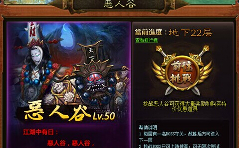 恶人谷只要玩家达到50级即可开启,侠客个数不能超过当前名望允许的最大数量,每层的BOSS只能挑战一次,黑市商人的每组道具只能购买一次。