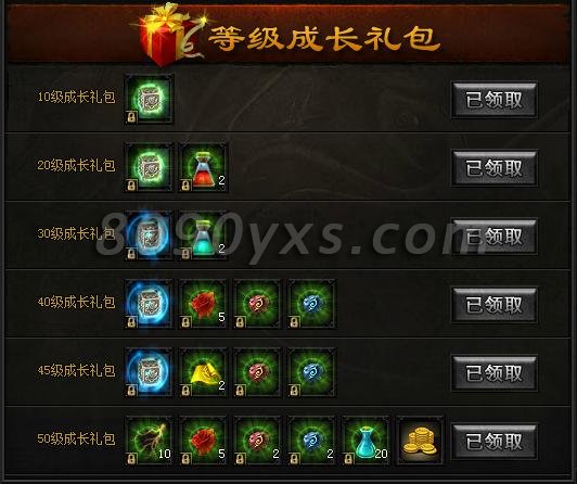 等级成长礼包共分为6个等级段,分别是:10级、20级、30级、40级、45级、50级。当玩家达到每个等级后,都可以领取对应的奖励。