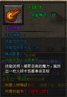 在任务的指引下,我们学会了第一个技能:火球术,也是法师最经典的小技能之一。