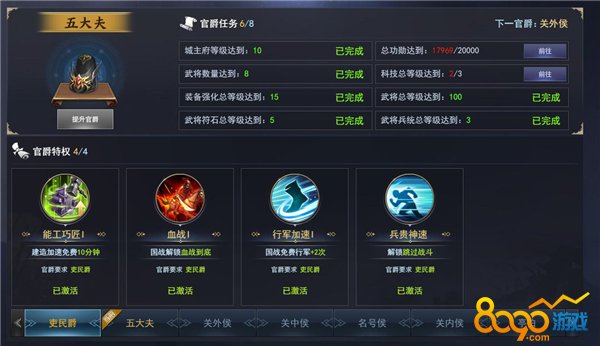 在官爵界面,有需要完成的人物,也有官爵独有的特权。直接是可以在界面清楚展示的,只要完成,就可以进入下一个官爵,开始新的任务。