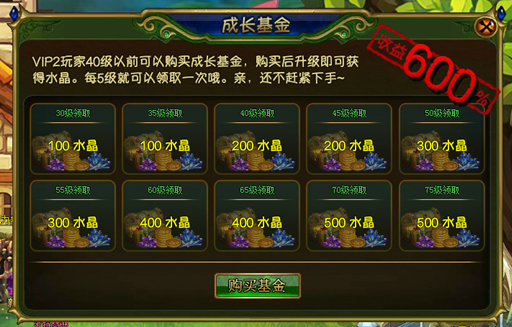 玩家在40级前,可购买成长基金。(限制购买权限为成为VIP2)