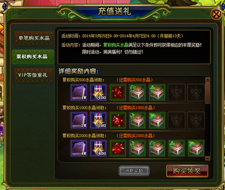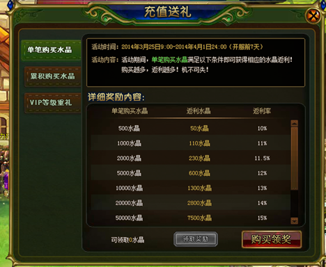 购买成功后,每到固定等级,玩家即可领取一定量水晶