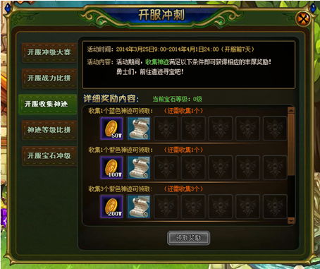 收集3个紫色神迹金币*200W六级宝石合成符