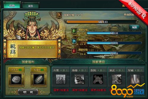 在8090大大争霸中有国才有家所以当大家达到一定等级的时候就可以选择不同的国家了哦,一共有吴蜀魏汉四个国家可以选择哦,当加入任意一个国家之后与其他的国家就形成敌对了哦。