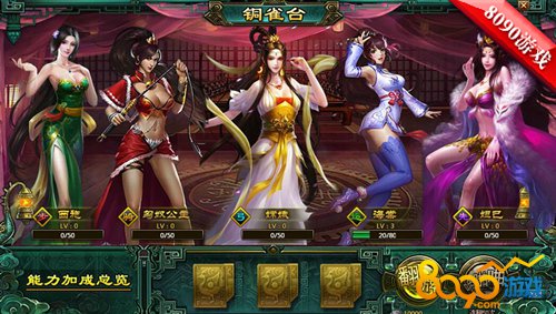 说到三国时期的风流韵事也是不少的,其中杜牧赤壁这首诗中的东风不与周郎便,铜雀春深锁二乔更是传颂的佳句,在8090大大争霸中想要获得各式各样的美女怎么少的了铜雀台呢,每一位美人都可以为大家提供各种属性和战力哦。