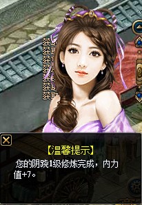 从15级开始,就可以修炼经脉,几乎角色等级每提升一级,我们就又有几条经脉可以修炼。点击“修行”,可以立即给我们的角色增加属性哦,页面右下角也会有位美女适时弹出,祝贺我们经脉修炼成功: