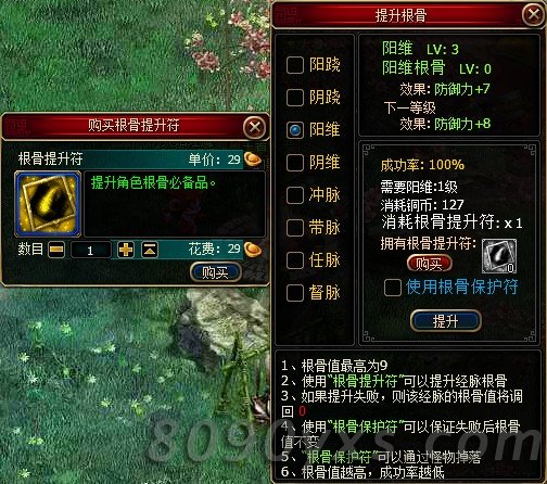 只要使用根骨提升符,就能提升根骨值,根骨值最高为9。但是根骨的提升是有可能会失败的,失败后根骨值掉落回0,机遇与风险并存。所以为了提升成功率,并且失败不掉落根骨值,可以使用“根骨保护符”,根骨保护符可以通过打怪掉落,但目前还没有在凡世间现身过,属于珍稀物品哦,大家获得之后拿出来炫炫吧。