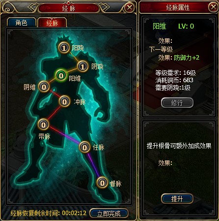 但郁闷的是到了中后期,每一级经脉修炼时间有点长,如何能快速的修炼完,在同级玩家中获得优势呢?使用经脉加速则能解决这样的问题,尤其是经脉恢复剩余时间旁边的“立即完成”这个选项,一点就能轻松地升级,不必再把时间浪费在无聊的等待上。如果你急着提升技能,包裹里有还有元宝,这就是最好不过的升级方法啦。