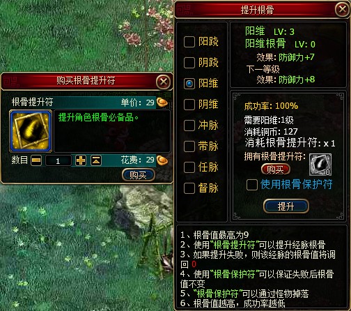 只要使用根骨提升符,就能提升根骨值,根骨值最高为9。但是根骨的提升是有可能会失败的,失败后根骨值掉落回0,机遇与风险并存。所以为了提升成功率,并且失败不掉落根骨值,可以使用“根骨保护符”,根骨保护符可以通过打怪掉落,但目前还没有在凡世间现身过,属于珍稀物品哦,大家获得之后拿出来炫炫吧。