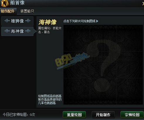 在大航海传奇中,每艘船最多可以放入6个同类不同部位的配件提升船只属性,可装配部位根据提督等级解锁,当一艘船中金色及暗金配件数大于等级2件时可以激活配件组合,获得组合属性,可以根据船只类型选择装配海神像或雄狮像。点开船首像中的制作配件,可以在左侧选取制作哪类,然后逐一点开9宫格的每一宫进行绘图,也可以点击批量绘图,自动翻开9宫。