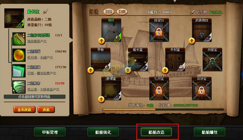 初始船只只有船长室及木材室两个船舱,达到一定等级可以开启其它船舱并进行船舱改造升级。改造船舱需要消耗对应等级的图纸及材料,材料可通过神秘商店、各个关卡刷怪获得。想要快速改造船舱?快点升级刷材料吧。