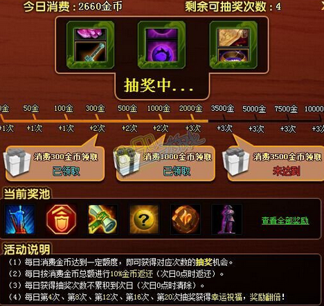 大航海传奇中的每日抽奖需要消费金币达到一定额度,才能获得对应次数的抽奖机会。每日按消费金币总额的10%进行返还哦,每日的第4次、第8次、第12次、第16次、第20次抽奖会获得幸运祝福,奖励翻倍哦,不过抽奖次数是不能够累计到次日的呢,所以一定要在当天使用完哦。