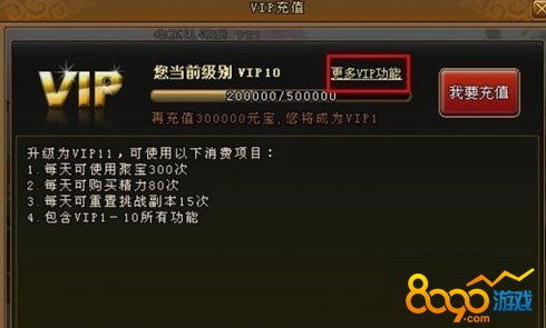 在界面右上角显示的是当前VIP等级,点击“充值”按钮即可进行充值。进入充值页面后,可以查看当前的VIP经验和下一等级的VIP会获得的功能。同时也可以点击“更多VIP功能”了解全部VIP的等级功能。