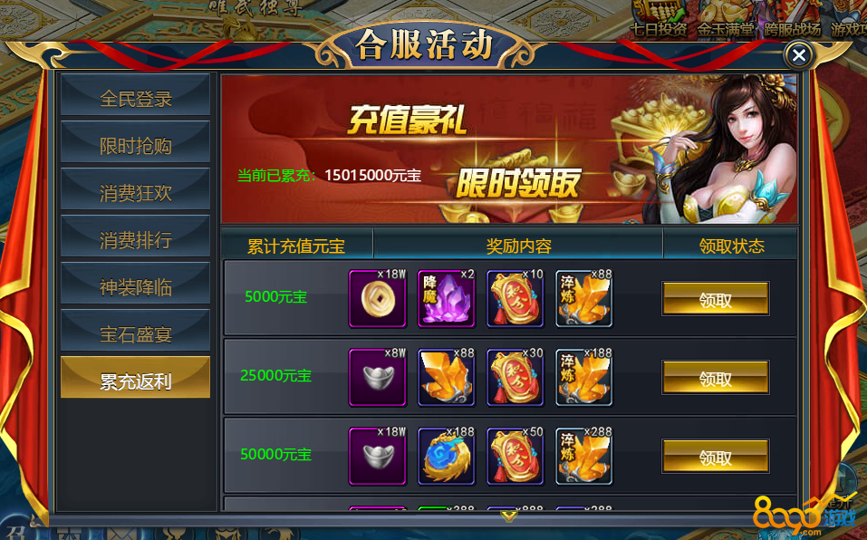 【活动规则】充值返利 充值的货币越多领取的物品就越多