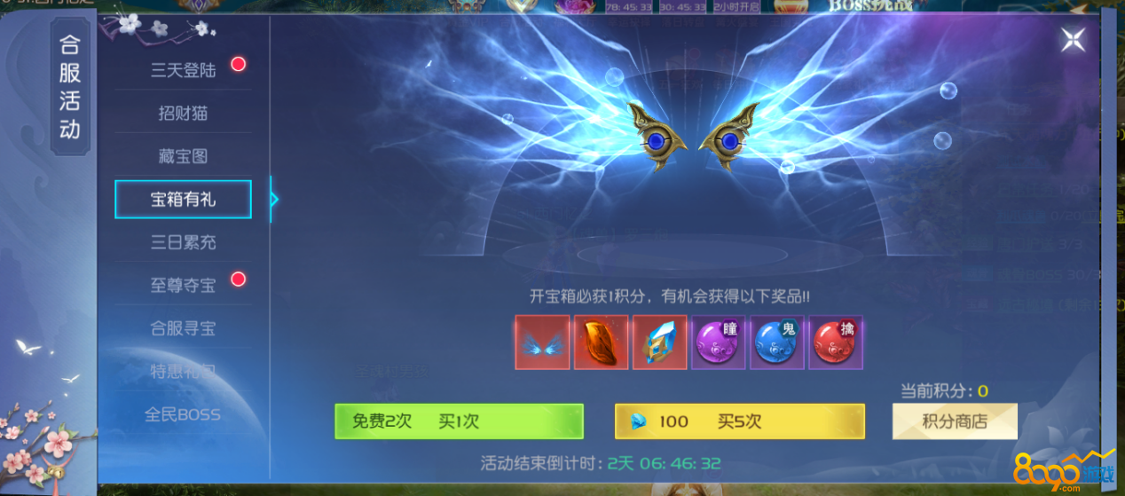 活动规则:活动期间可花费25钻石购买宝箱进行抽奖,开宝箱能获得奖品且必定获得1积分,积分可在积分商店中换取奖励