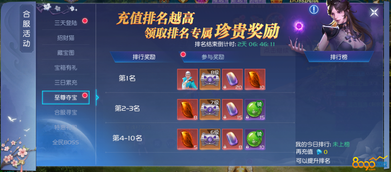 活动规则:活动期间充值2000钻石以上可参与争夺第一名奖励,充值1000钻石以上可领取参与奖励同时参与争夺其他排名奖励
