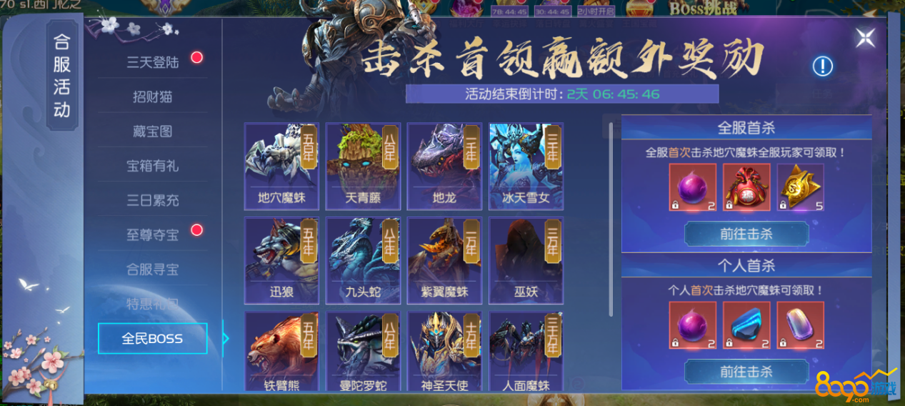 活动规则:活动期间多人boss首次被玩家击杀的区服,全服玩家可免费领取全服首杀奖励;玩家个人击杀对应多人boss可免费领取个人首杀奖励