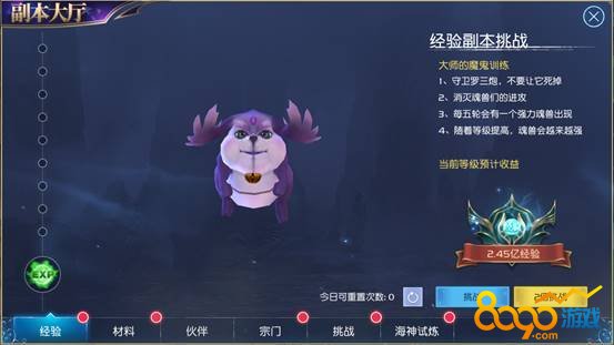 当我们进入副本大厅,可以看到很多副本可以挑战,玩家们达到对应的等级就可以开启。首先我们的经验副本挑战,玩家在这个副本内守卫罗三炮,低档魂兽的进攻,并获得大量的经验值。