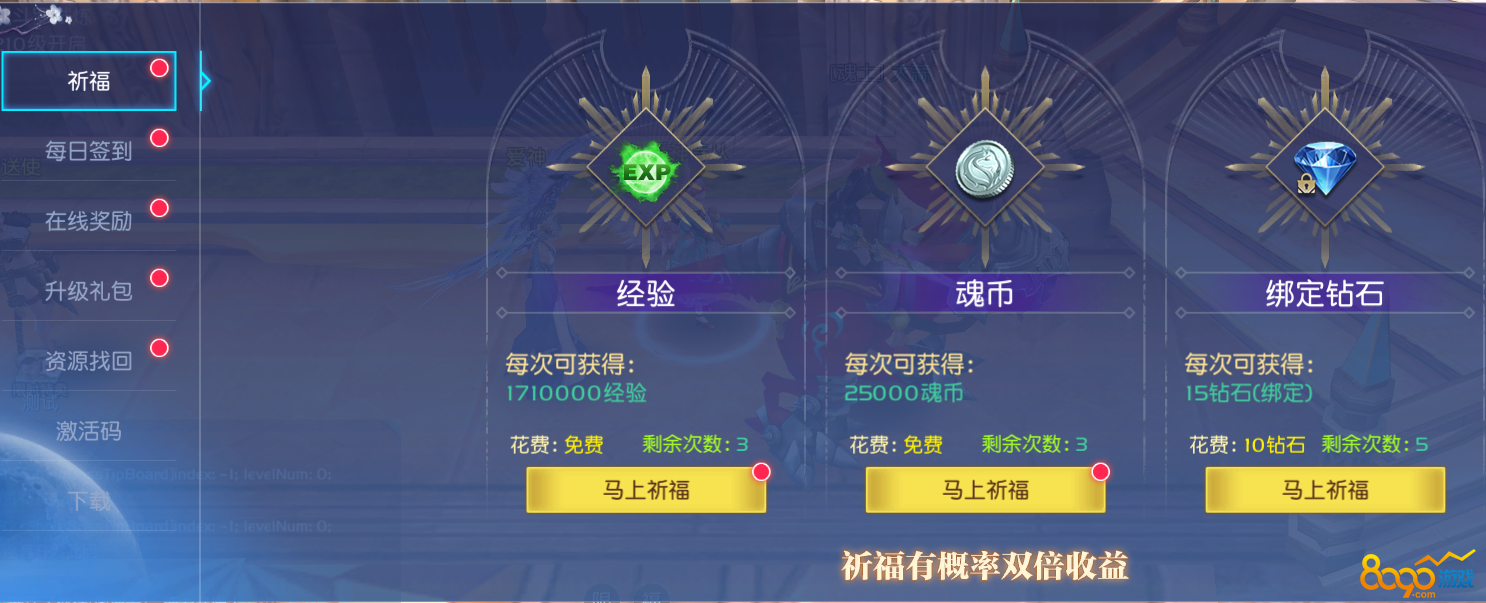 开启祈福系统,祈福每天可以分别进行三种祈福,分别是:经验祈福、魂币祈福、绑定钻石祈福。点击马上祈福,就可以活动相对应的奖励,前两个是免费的。绑币是需要钻石的。
