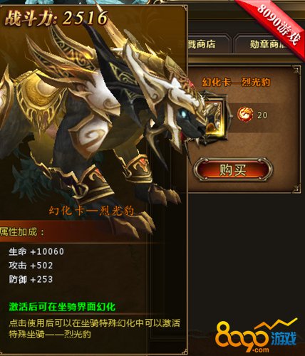 下面我们回归正题想要获得烈光豹的幻化卡大家可以在兑换商城中购买兑换获得,但是值得注意的是在这里需要20点的幻化精魄才行哦,可以通过幸运转盘中的累计积分兑换精魄呢!