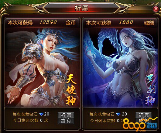 玩家可以在祈愿界面内花费钻石来求得金币或魂能,每日祈求的次数都是有限的,不过玩家可以通过提升VIP等级的方式提升每日的祈愿次数。两种方式分开计算次数。