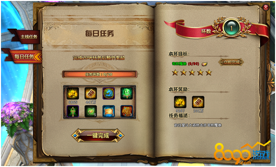 1) 每日任务共有20环,完成每环均可获得大量经验和金币奖励,玩家可花费钻石或绑钻将任务星级提升为最高,以获取额外的奖励收益。