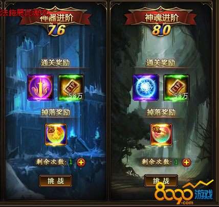 通关对应的副本,玩家还会获得相对应的掉落,有坐骑成长丹,神翼成长丹,神装成长丹,神兵成长丹,神器成长丹,神魂成长丹。都是玩家非常需要的成长材料,能极大提高玩家的战力。
