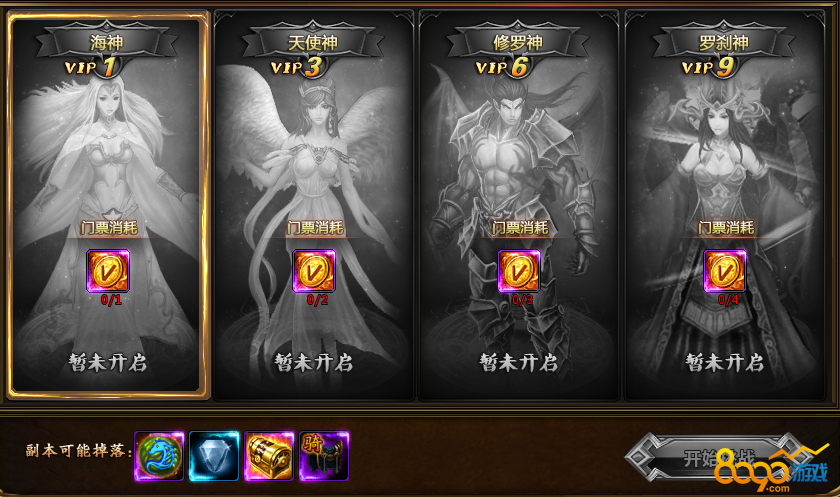 斗罗大陆VIP副本共有四关可供选择,分别为V1对应限制的海神,V3对应限制的天使神,V6修罗神,V9罗刹神,四关分别消耗一张,依次递增一张门票。