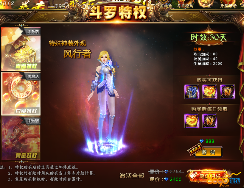 特权购买后的道具通过邮件发送。特权有效时间从购买当日零点开始计算。重复购买特权时,有效时间会累积的。玩家可以不用担心浪费钻石。