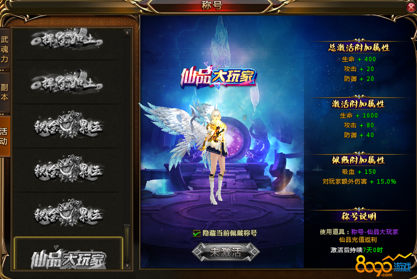 活动获得称号更为多样,基本是游戏活动所来获得。激活后提供的属性更为强大,不仅提供总的激活属性和佩戴属性加成,激活单个的属性也很是强大。