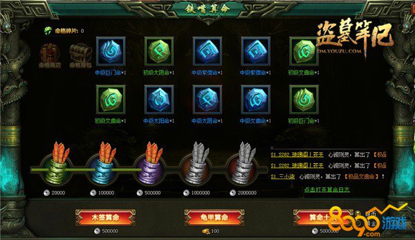 算前世今生,断生死祸福。凭借着一身算命本事立足于九门之位的齐八爷这回将铺子开到了《盗墓笔记》,在玄奇神秘的铁嘴算命系统中,角色到达150级的玩家们任意使用木签或龟甲算命可获得不同品质的命格碎片。配合着另一全新伙伴命格功能将为玩家们带来大幅度的属性和战力提升。要知道,八爷的卦可是算的神准哦!