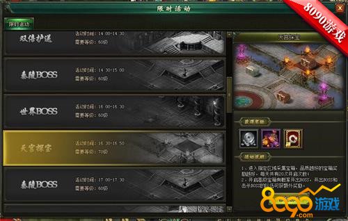 在8090盗墓笔记中,天宫探宝在每天的16:30-16:50以及22:30-22:50两个时间段开启。天宫每隔一段时间刷新一波宝箱,宝箱有低级,中级,高级三种。品质越好的宝箱奖励越高,每天一共有20次开启宝箱的机会。开启高级宝箱有一定概率开出BOSS,开出BOSS和击杀BOSS的队伍都能获得额外的奖励,每种宝箱都能开出银币,随机进阶丹包,以及图鉴,更能开出和氏璧碎片哦!如此珍贵的文物,不去碰碰运气怎么行?