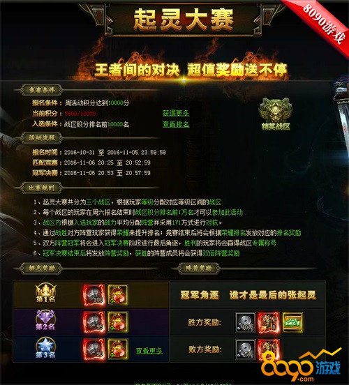 在8090盗墓笔记中,起灵大赛参赛条件很简单,只需要每天完成游戏内的活动以及日常任务就能获得积分,同时每充值一元也能获得30点积分哦。周活动积分达到1W分就能报名参加啦。起灵大赛共分为三个战区,根据玩家等级分配对应等级区间的战区,战区内根据对方阵营的战力平均分配阵营并采用1V1方式进行对抗,通过战胜对方阵营玩家获得荣耀来提升排名,竞赛结束后将会根据荣耀排行发放对应排名奖励,双方阵容冠军将会进入冠军决赛阶段进行最后角逐,胜利的玩家将会赢得战区专属称号。
