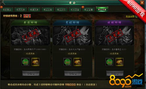 在游戏里,帮会成员共享击杀数量,达到数量即完成该狩猎任务,所有帮友均可领取奖励,帮派狩猎目前奖励有两种,经验奖励以及绑金奖励,每天就算没有时间完成,但是可别忘记还有勤劳的帮友,所以要记得领取奖励哦!感兴趣的玩家就快来游戏里看看!