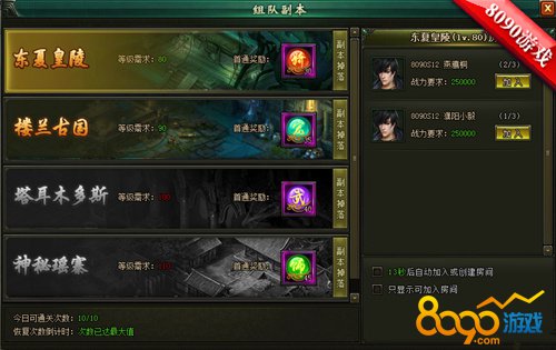 搜索"8090网页游戏"在8090盗墓笔记,总是一个人单打独斗有什么意思,要是能和小伙伴一起参加组队副本共同战斗,不仅更有趣,还能获取更多的装备哦!是不是很心动啊!话不多说,接下来,就一起来游戏里看看组队的玩法!