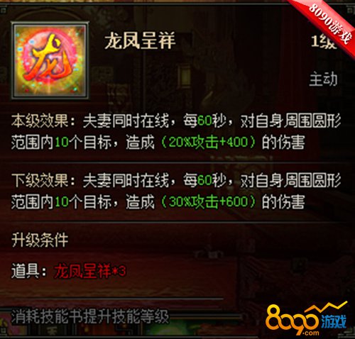 在游戏里,龙凤呈祥这个姻缘技能是一个主动释放的伤害性技能。龙凤呈祥技能效果会在夫妻同时在线的每60秒,对自身周围圆形范围内10个目标,造成50%攻击+1000的伤害哦!