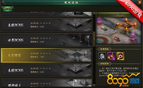 在游戏里,玩家的等级到达70级就可以参加活动啦!天宫探宝在每天的16:30-16:50以及22:30-22:50两个时间段开启。天宫每隔一段时间刷新一波宝箱,宝箱有低级,中级,高级三种哦!