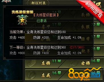 洗练除了可以获得更多的属性加成之外还可以增加额外的属性哦,当全身洗练星级综合达到180级时攻击增加400、防御增加200、生命加成1.0% ,当全身洗练星级综合达到360级时攻击增加800、防御增加400、生命加成2.0%。