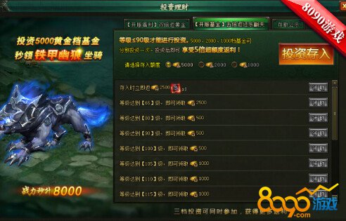 搜索"8090网页游戏"8090盗墓笔记中有许多的活动,尤其是首充返利,在首充返利里面有一个非常好的活动就是黄金投资,通过黄金投资活动就可以领取铁甲幽狼的幻化卡。