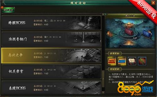 南北之争从来都没分出胜负的,你敢不敢来做这个掘墓人?战场还有两个BOSS刷新点,BOSS死亡后3分钟刷新一次。己方棺材每秒产生积分,对BOSS造成最后一击可获得积分,击杀敌对可获得积分,所在派系积分率先达到60000分或者活动开始20分钟后,积分更高的一派。