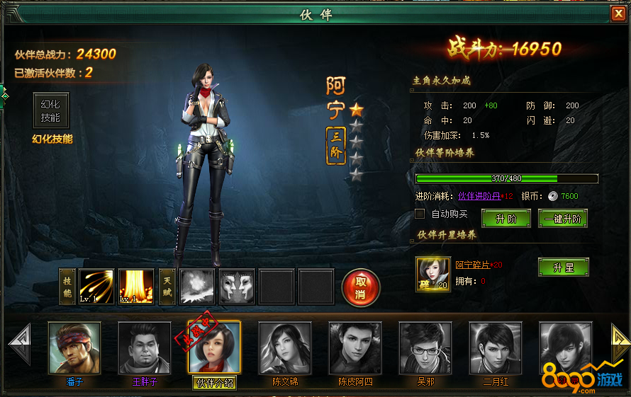 伙伴战力是根据玩家:出战伙伴战力+主角永久加成+羁绊效果的总和。最佳组合是:潘子(3阶)+阿宁(3阶)+吴邪(3阶)。