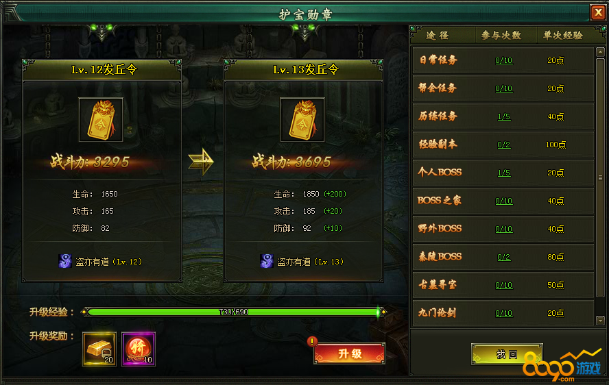 那么护宝勋章怎么升级呢?它的升级主要来源于右侧的任务列表,只要按照上面的任务逐项完成就可以了。
