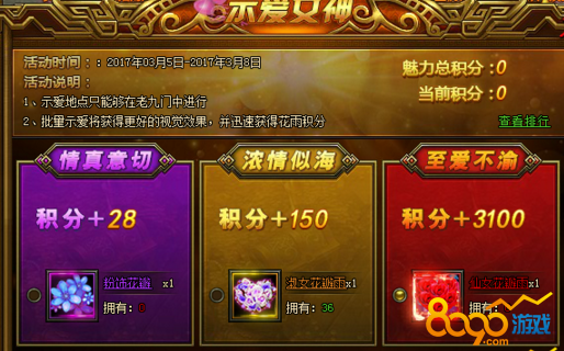 盗墓笔记浪漫女神节现在一共有四个大活动,一个是浪漫满屋,这个类似的活动在过年的时候出过一次,就是在老九门消耗活动材料,获取积分。本次是示爱女神,三种材料。低级的每个加28积分,中级的每个加150积分,高级的加3100积分。记得需要在老九门示爱女神消耗材料才有效果哦!