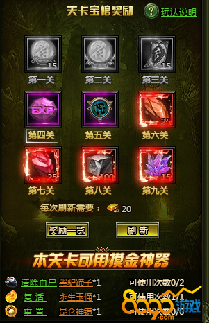 天星风水活动共有9关,每一关玩家可以选择一个棺材进行摸金,每次摸金消耗一个开棺金符,达到最后一个关卡,奖励会非常丰厚。而且关卡奖励我们可以手动刷新,更改奖励的道具。