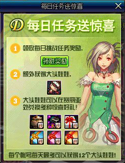 最主要的就是2015年5月21日至6月18日,勇士们完成每日挑战任务即可获得【大头娃娃】兑换【金库扩展券】、【物品栏扩展券】、【装备品级调整箱】、【强烈的气息】等各种奖励!