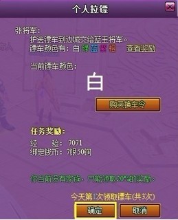 个人拉镖也是斗破苍穹2的玩家很好的财政收入,因为个人拉镖的所有收入都归玩家自己所有。镖车根据颜色的不同,奖励也是大小之分,普通玩家一般默认是白色,也就是最低级的,但玩家可用换车令来改变镖车的颜色而使奖励最大化。最好的镖车颜色是橙色,奖励也是最高的。如果待到全民运镖时间,还可以获得不绑定钱币呢。