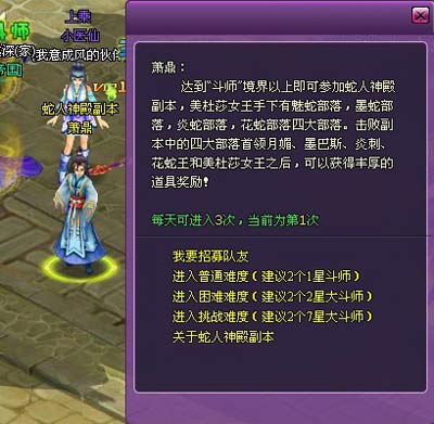 在帝国-帝都萧鼎处,可以招募队友选择不同难度一同进入蛇人神殿副本。