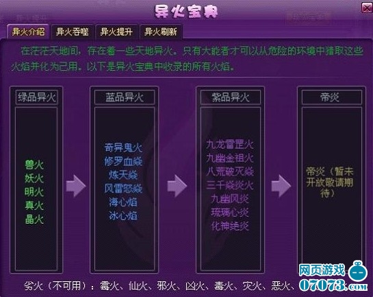紫色的异火只能通过蓝品异火提升等级达到10级进阶获得。同样也会大大提升玩家各种属性。异火需要进行吞噬其他异火才会获得经验升级。吞噬异火不能吞噬比主主体等级高的异火。当异火达到10级后可以进行提升。