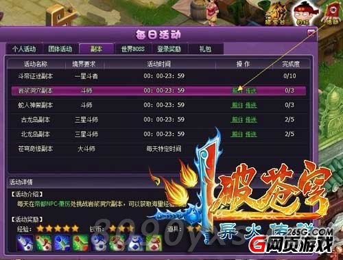 当做完主线及支线任务都还没升级的时候,记得要通过其他途径来获取经验了。在《斗破苍穹2》里,熔岩副本是每天必去的地方,为什么呢?因为熔岩副本有很丰富的经验可得,如果你再开个双倍经验的话,那升级的速度像飞一样。这个副本的难度不是很高,由于该副本每天只能进入三次,玩家可要好好的珍惜这个机会哦!