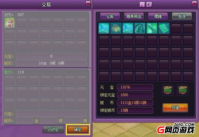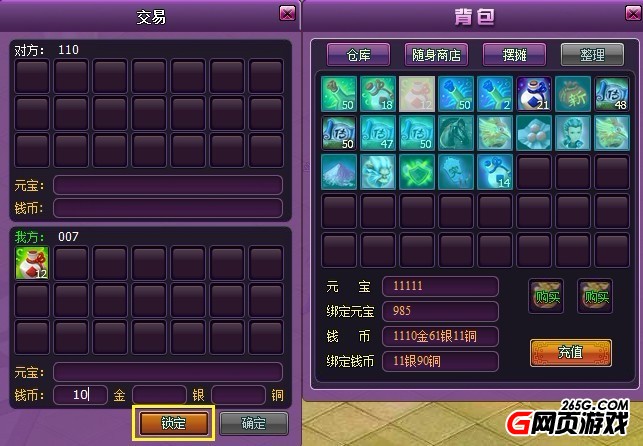 2. 对方同意后出现交易界面,将想要交易的物品拖到交易栏,如若交易游戏币则直接输入游戏币的数值。确认交易物品后点击“锁定”,对方就可以看到我方交易的物品了。